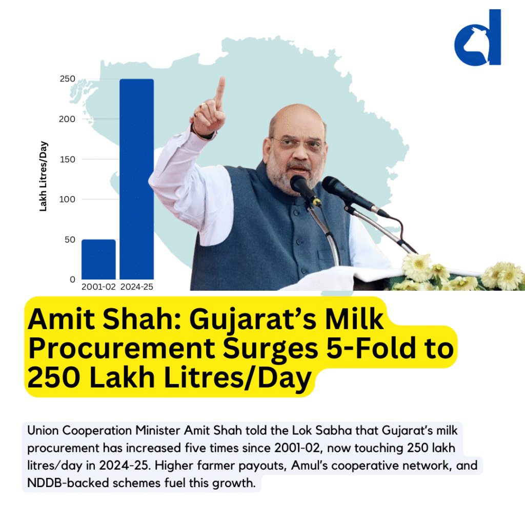 Gujarat’s Dairy Growth Spotlighted in Parliament Gujarat’s dairy sector has achieved remarkable growth, with milk procurement rising fivefold over the last two decades. In a written reply to the Lok Sabha on Tuesday, Union Cooperation Minister Amit Shah confirmed that daily procurement has jumped from 50 lakh litres in 2001-02 to nearly 250 lakh litres […]