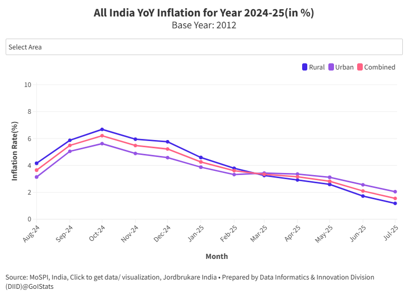 Base Year: 2012 India’s Consumer Price Index (CPI)-based inflation, a key measure of price stability, has shown a significant cooling trend over the past 12 months. The data for August 2024 to July 2025 reveals a steep decline from post-monsoon peaks in October 2024 to multi-year lows by July 2025. Peak and Decline High […]