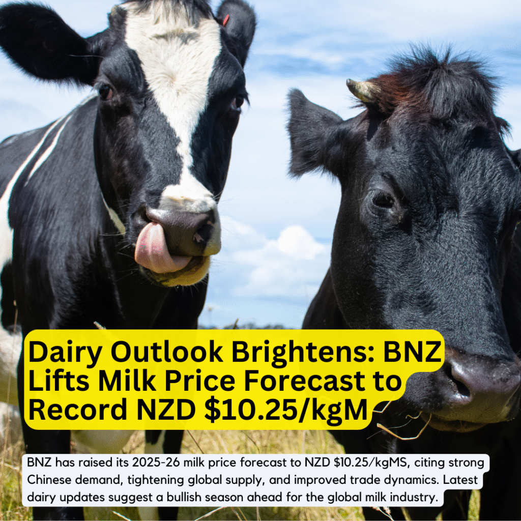 A bullish outlook for global dairy markets, driven by tightening supply and strong Chinese demand, has prompted the Bank of New Zealand (BNZ) to revise its 2025-26 milk price forecast upward to NZD 10.25/kgMS. This makes it the highest forecast to date, surpassing Fonterra’s midpoint projection by 25 cents. BNZ Senior Economist Doug Steel attributed […]